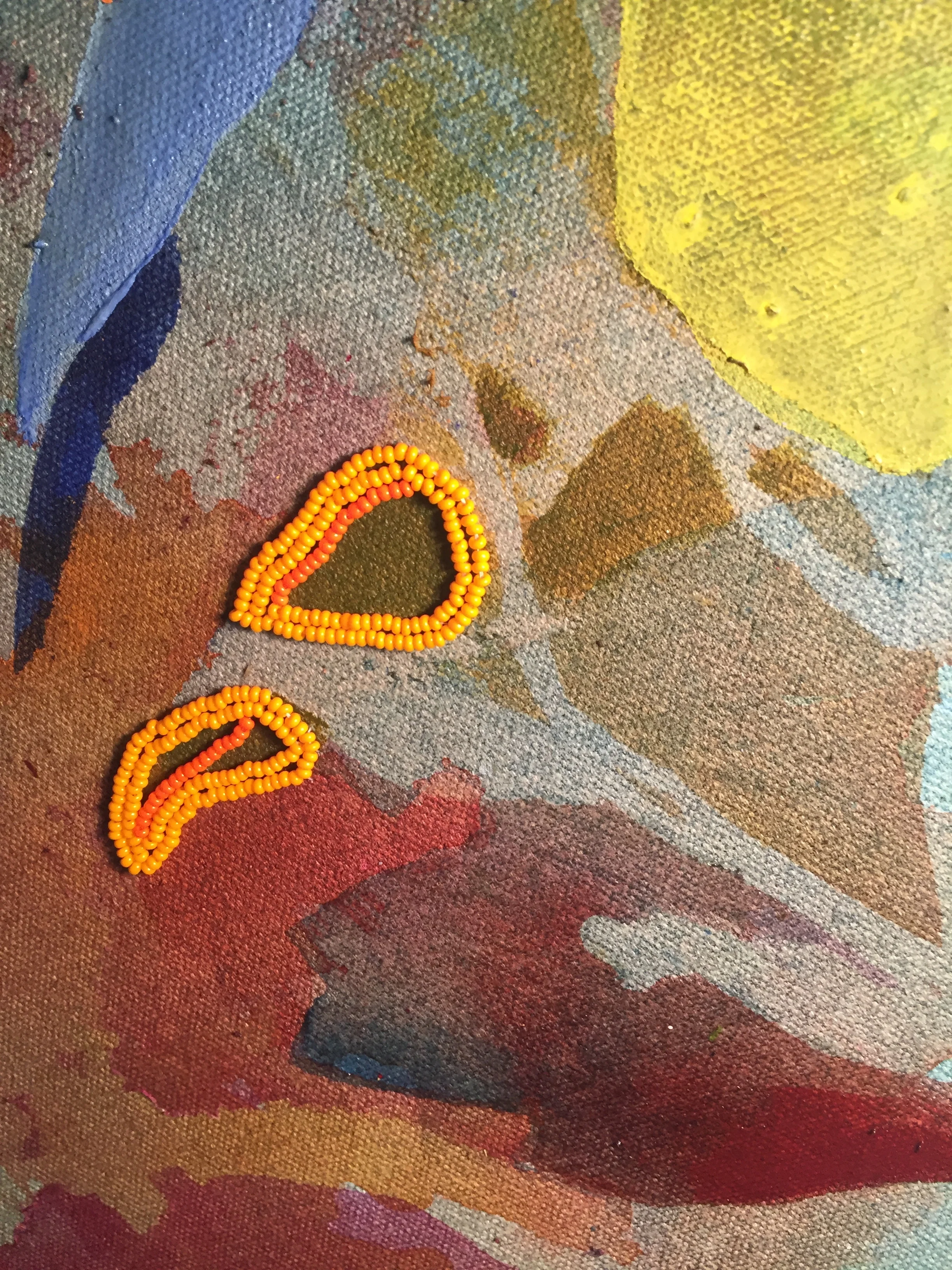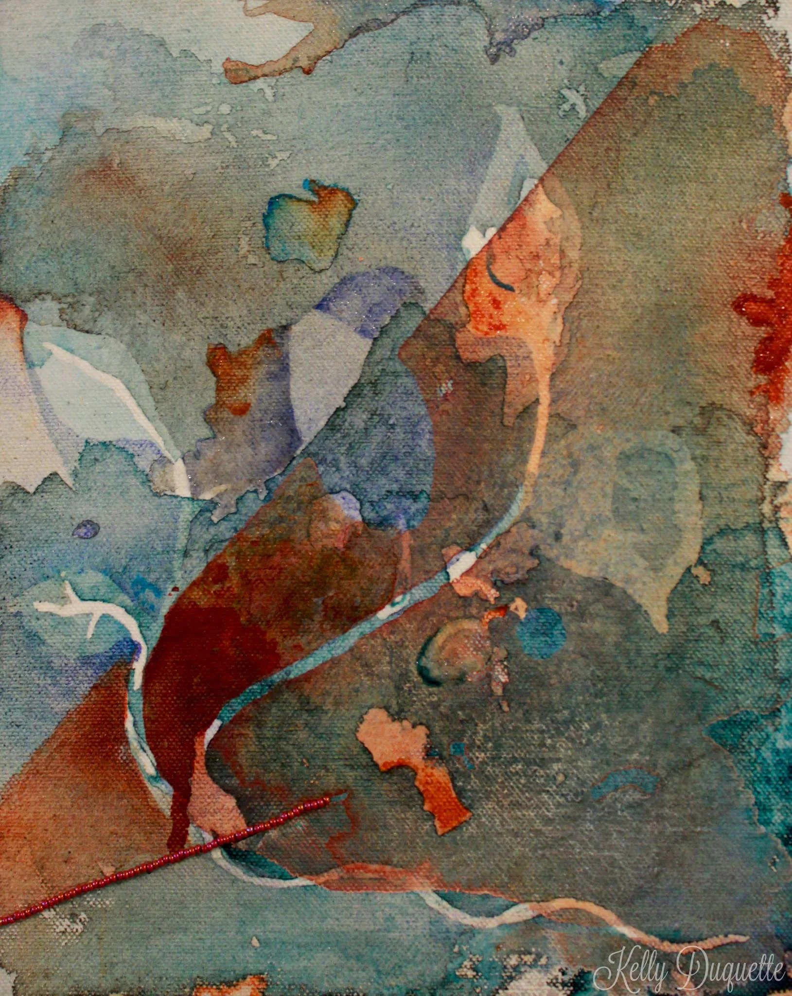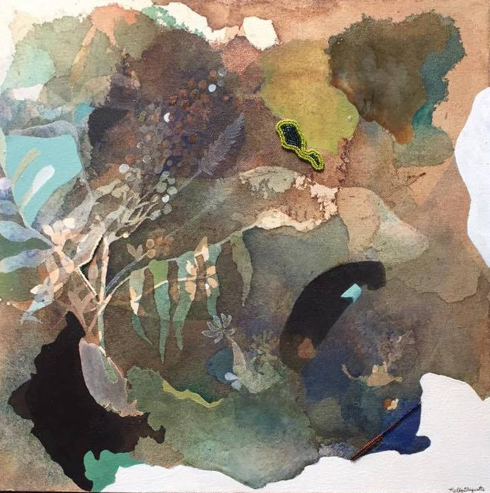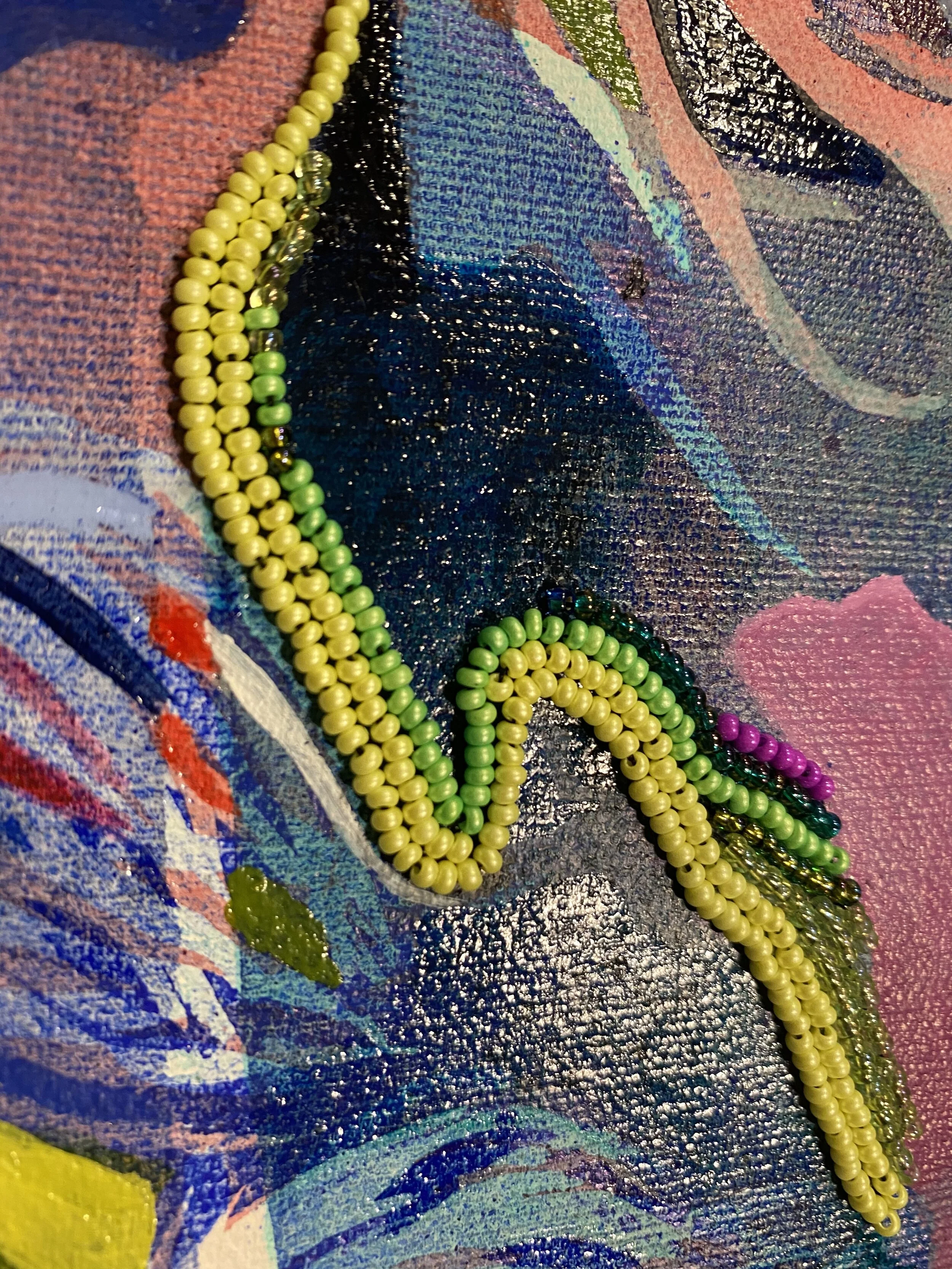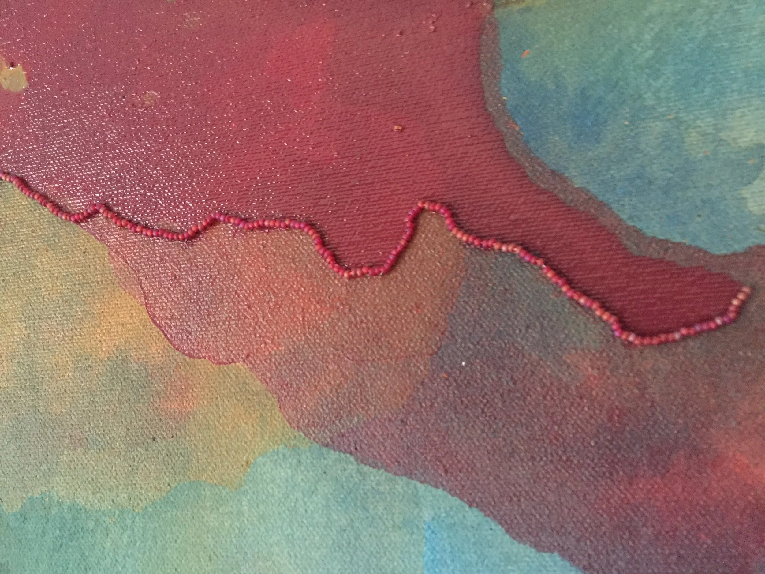 Acrylic washes and beadwork through stretched canvas and hand-built stretcher.