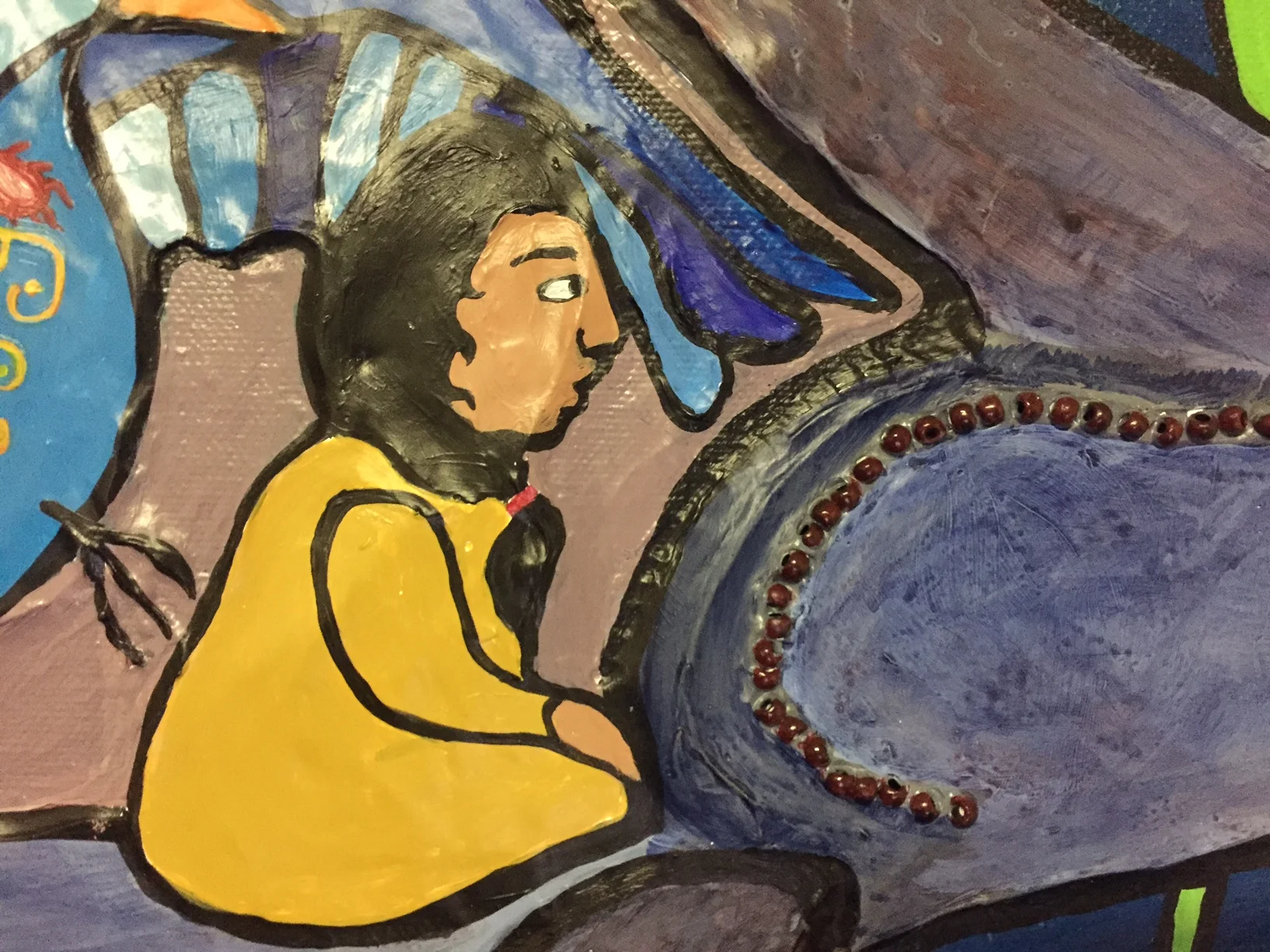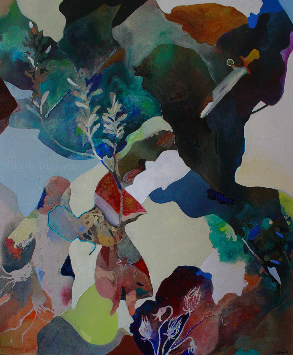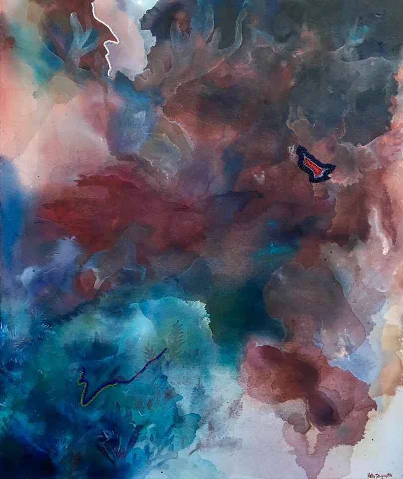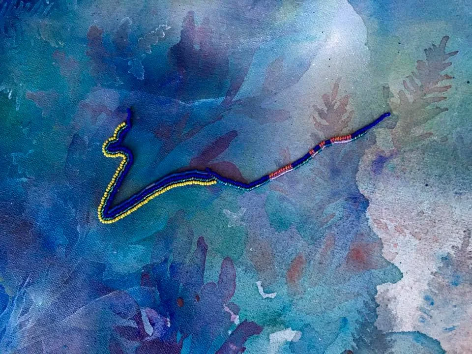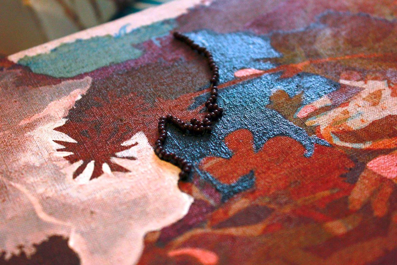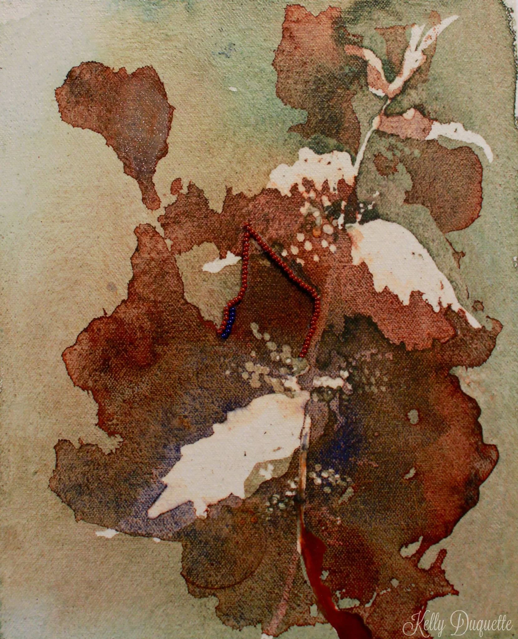 Acrylic washes and beadwork through stretched canvas and hand-built stretcher.