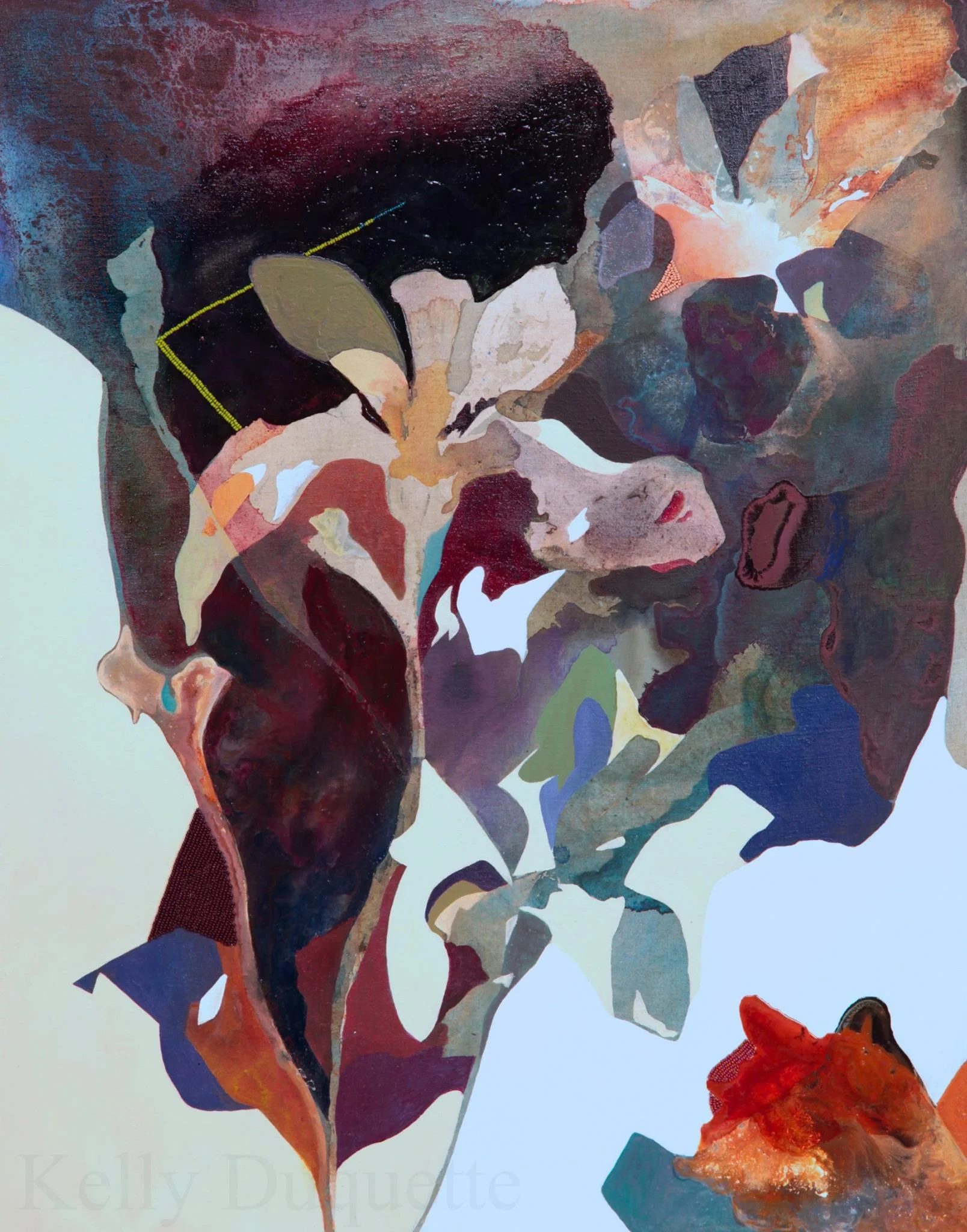 Acrylic paint, dispersion pigments, pouring medium and beadwork on stretched canvas.
