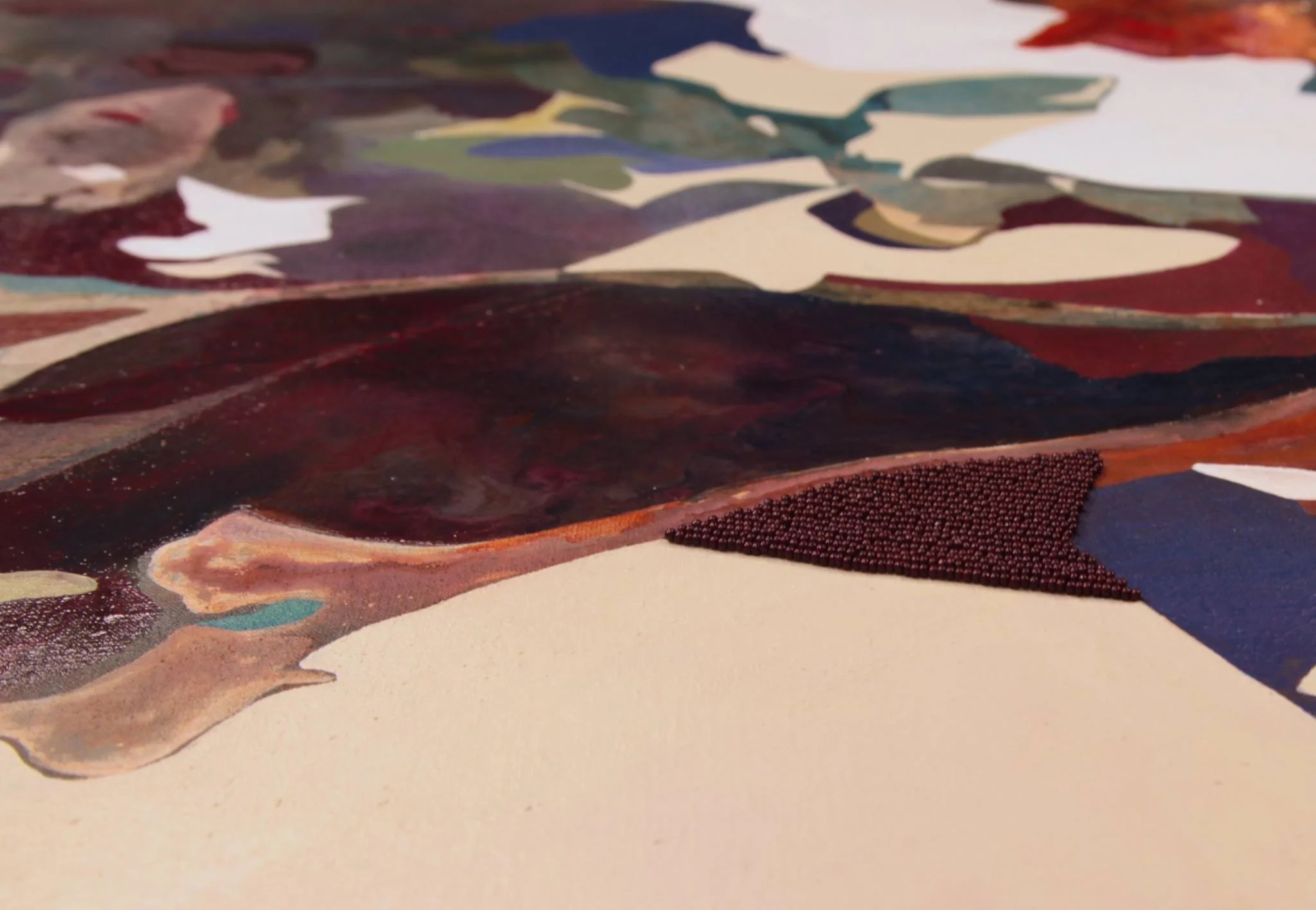 Acrylic paint, dispersion pigment, pouring medium and beadwork through Belgium linen on hand-built stretchers.