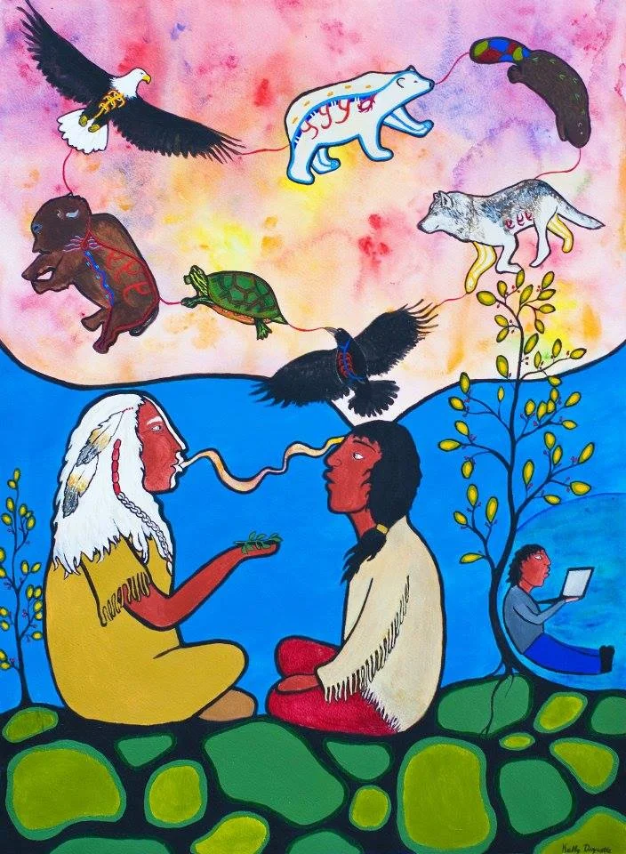 “Disconnected” depicts an Elder passing teachings to a youth; each of the teachings is represented by its respective animal. However, the “disconnected” youth, lost in the world of his laptop, does not realize what is going on. It speaks about a gap in the transfer of Indigenous knowledge, and the realities Indigenous peoples face after years of colonization.