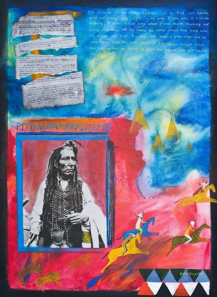 The photo that I used of Poundmaker in the piece was very gallant, which even further illustrates his character and shows him as a proud, formidable being. I wanted to show this strength in my art. There were many aspects of life that had been lost. Aboriginal culture was ridiculed and shamed for many years. My family is just starting to learn about our rich, Metis heritage, which had been hidden away by our ancestors who were trying to fit into a European society.